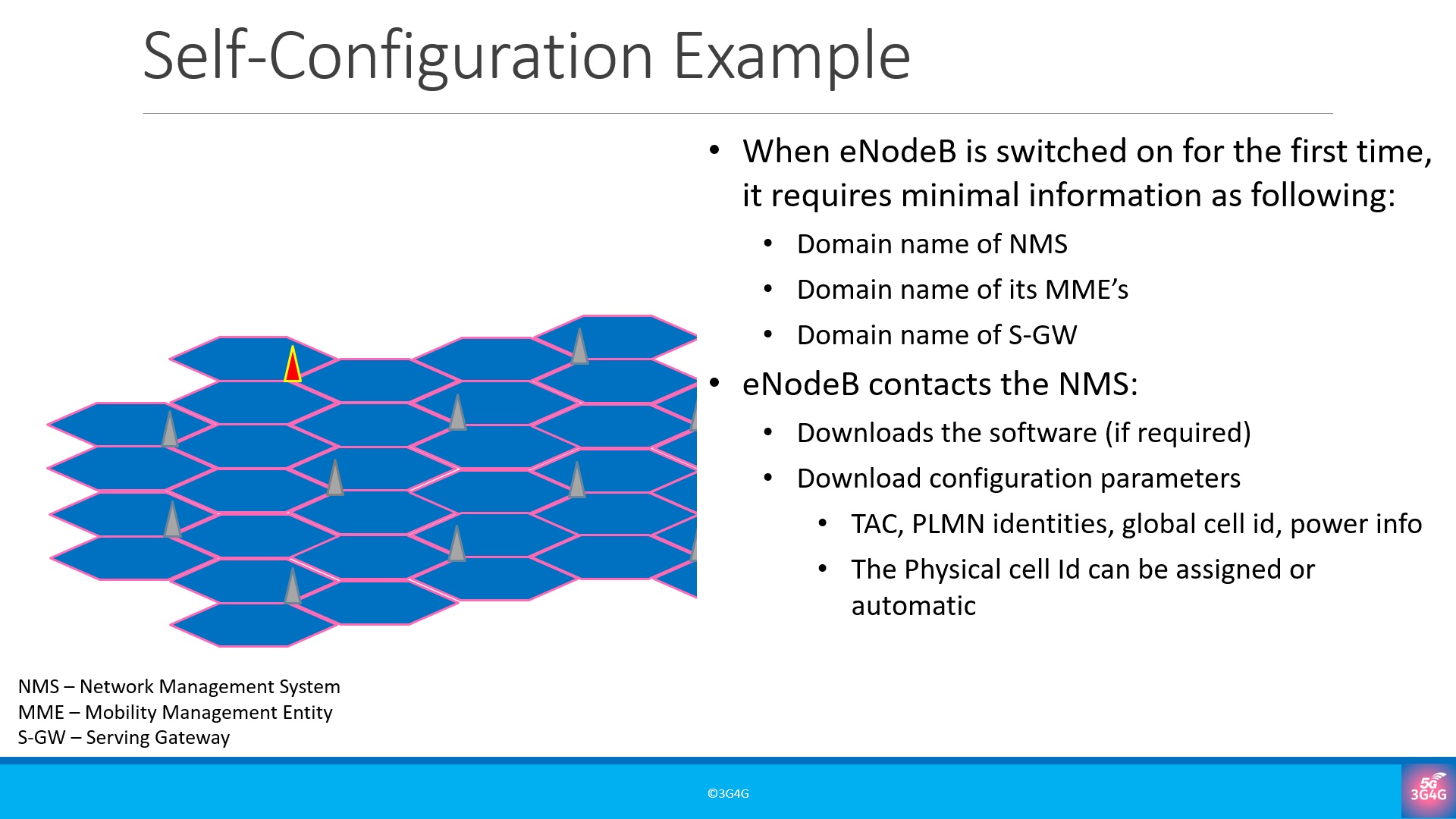 In this part we will look at what features were defined as part of 3GPP Release-8 The most basic functionality where SON helps is when a new eNodeB is switched on. This functionality is known as self-configuration which helps eNodeB decide on its parameters, codes, power levels, etc. VIDEO SLIDES You can download the slides here