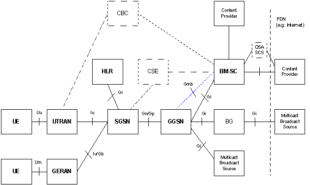 MBMS Architecture is as shown above. The dotted lines means functions / reference points that are optional. Gp applies only when SGSN and GGSN are in different PLMN.