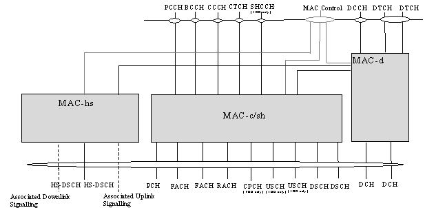 The MAC-d entity is responsible for mapping dedicated logical channels for the uplink either onto dedicated transport channels or to transfer data to MAC-c/sh to be transmitted via common channels. One dedicated logical channel can be mapped simultaneously onto DCH and DSCH. One dedicated logical channel can be simultaneously mapped onto DCH and HS-DSCH. The MAC-d entity has a connection to the MAC-c/sh entity. This connection is used to transfer data to the MAC-c/sh to transmit data on transport channels that are handled by MAC-c/sh (uplink) or to receive data from transport channels that are handled by MAC-c/sh (downlink). The MAC-d entity has a connection to the MAC-hs entity. This connection is used to receive data from the HS-DSCH transport channel which is handled by MAC-hs (downlink). There is one MAC-d entity in the UE. In terms of implementation and design perspective it is initiated by one of two events...