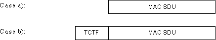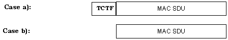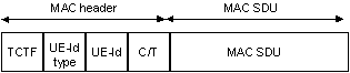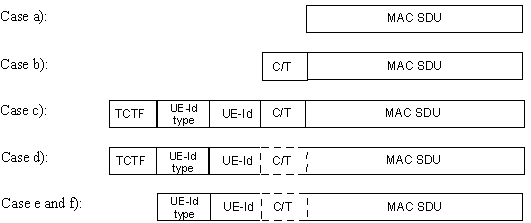 MAC header for DTCH and DCCH (not mapped on HS-DSCH) a) DTCH or DCCH mapped to DCH, no multiplexing of dedicated channels on MAC: no MAC header is required. b) DTCH or DCCH mapped to DCH, with multiplexing of dedicated channels on MAC: C/T field is included in MAC header. c) DTCH or DCCH mapped to RACH/FACH: TCTF field, C/T field, UE-Id type field and UE-Id are included in the MAC header. For FACH, the UE-Id type field used is the C-RNTI or U-RNTI. For RACH, the UE-Id type field used is the C-RNTI. d) DTCH or DCCH mapped to DSCH or USCH: the TCTF field is included in the MAC header for TDD only. The UE-Id type and UE-Id are included in the MAC header for FDD only. The UE-Id type field used is the DSCH-RNTI. The C/T field is included if multiplexing on MAC is applied. e) DTCH or DCCH mapped to DSCH or USCH where DTCH or DCCH are the only logical channels: the UE-Id type and UE-Id are included in the MAC header for FDD only. The UE-Id type field used is the DSCH-RNTI. The C/T field is included in the MAC header if multiplexing on MAC is applied. f) DTCH or DCCH mapped to CPCH: UE-Id type field and UE-Id are included in the MAC header. The C/T field is included in the MAC header if multiplexing on MAC is applied. The UE-Id type field used is the C-RNTI. ![]() MAC PDU formats for DTCH and DCCH MAC-d Header for DTCH and DCCH (mapped on HS-DSCH) The MAC-d PDU header for DTCH and DCCH mapped on HS-DSCH is as shown in figure below. C/T field is included in the MAC-d PDU header if multiplexing on MAC is applied. ![]() MAC-d PDU format for DTCH and DCCH mapped on HS-DSCH MAC header for BCCH a) BCCH mapped to BCH: no MAC header is included. b) BCCH mapped to FACH: the TCTF field is included in MAC header. ![]() MAC PDU formats for BCCH MAC header for PCCH There is no MAC header for PCCH. MAC header for CCCH CCCH mapped to RACH/FACH: TCTF field is included in MAC header. ![]() MAC PDU formats for CCCH MAC Header for CTCH The TCTF field is included as MAC header for CTCH as shown in figure below. ![]() MAC PDU format for CTCH MAC Header for SHCCH The MAC header for SHCCH is as shown in figure below. ![]() MAC PDU format for SHCCH a) SHCCH mapped to RACH and USCH/FACH and DSCH: TCTF has to be included. b) SHCCH mapped to RACH and USCH/FACH and DSCH, where SHCCH is the only channel. MAC PDU: Parameters of the MAC header (HS-DSCH)