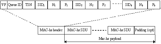 ![]() Both the MAC header and the MAC SDU are of variable size. The content and the size of the MAC header depends on the type of the logical channel, and in some cases none of the parameters in the MAC header are needed. The size of the MAC-SDU depends on the size of the RLC-PDU, which is defined during the setup procedure. MAC-d PDU (HS-DSCH) For HS-DSCH the MAC-d PDU format equals the MAC PDU format for the non HS-DSCH case. MAC PDU (HS-DSCH) In case of HS-DSCH a MAC PDU consists of one MAC-hs header and one or more MAC-hs SDUs where each MAC-hs SDU equals a MAC-d PDU. A maximum of one MAC-hs PDU can be transmitted in a TTI per UE. The MAC-hs header is of variable size. The MAC-hs SDUs in one TTI belongs to the same reordering queue.