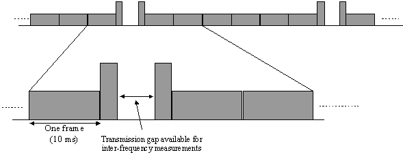 ![]() The figure above gives an idea of how the frame is compressed for performing measurements. In compressed frames, TGL slots from Nfirst to Nlast are not used for transmission of data. As illustrated in figure, the instantaneous transmit power is increased in the compressed frame in order to keep the quality (BER, FER, etc.) unaffected by the reduced processing gain. The amount of power increase depends on the transmission time reduction method. What frames are compressed, are decided by the network. When in compressed mode, compressed frames can occur periodically, as illustrated in figure, or requested on demand. The rate and type of compressed frames is variable and depends on the environment and the measurement requirements.