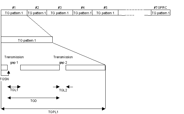 Parameterisation of the compressed mode [3] In response to a request from higher layers, the UTRAN shall signal to the UE the compressed mode parameters. A transmission gap pattern sequence consists of consecutive occurrences of transmission gap pattern 1, where transmission gap pattern 1 consists of one or two transmission gaps. See figure below.